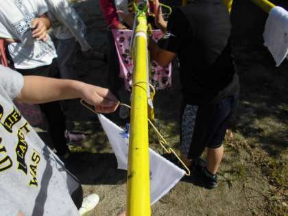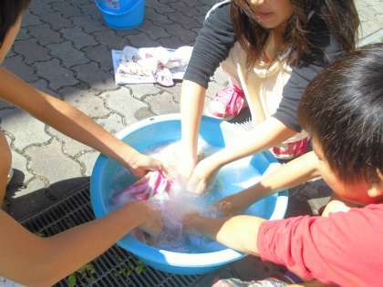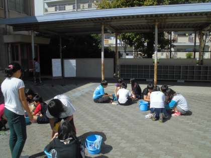 家庭科の学習で洗濯の実習をしました。洗濯機での洗濯をしたことがある子はたくさんいますが,この学習では手洗いでの洗濯をしました。つまみ洗い・もみ洗い・おし洗い等,様々な洗い方を実践しました。汚れ方や布の種類によって洗い方を変えるとよいことが分かりました。「意外と簡単だった。」「洗濯表示で手洗いとなっているものは,家でもやってみよう。」「手洗いの方が汚れが落ちるかもしれん。」などといった感想を言っていました。