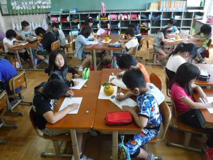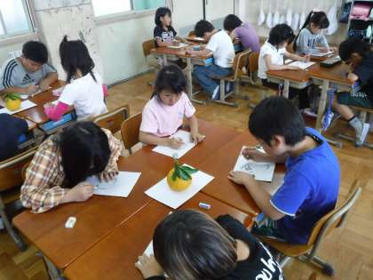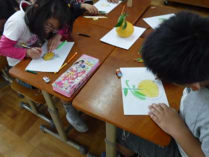 本日の図工の学習では,学校に生っている夏みかんのスケッチを行いました。