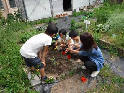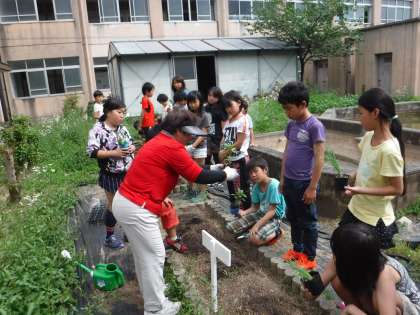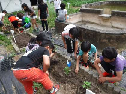 京野菜の苗を植えました。はじめ土をやわらかくして,乾いた土に水を上げました。苗は根を気づ付けないように出し,根がしっかりはうように根をやわらかくほぐしてから植えました。