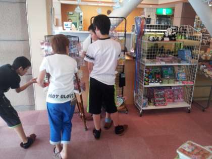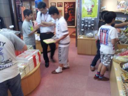 旅館で家族へのお土産を選んでいます。