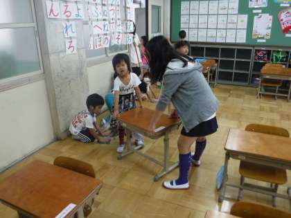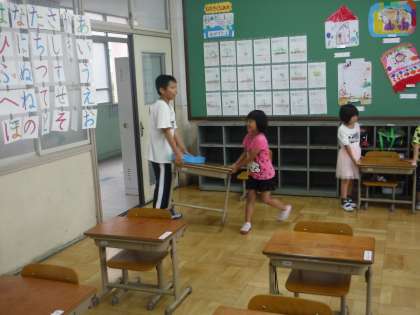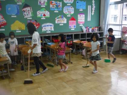 これまで掃除は先生と一緒にしてきましたが,今日から6年生が教えながら一緒にそうじ