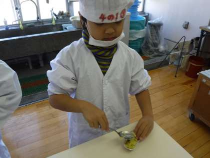 おいもの皮をむいたり、マッシャーでつぶしたり、型に入れたり。