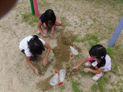 生活科「なつだ,とびだそう」の学習をしました。マヨネーズなどの空き容器の中に水を入れ,地面に絵を書いたり,砂山に川を作ったり,さまざまな遊び方を楽しみました。季節を感じる遊びをたくさんし,良い活動することができました。