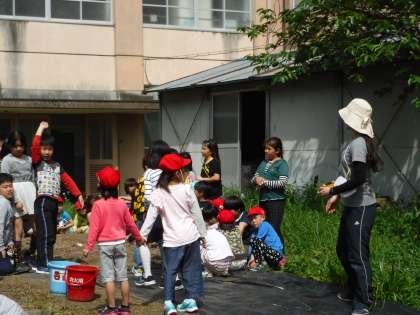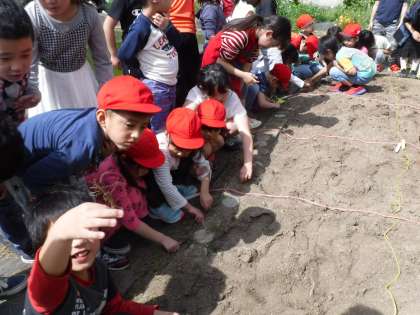 今日は3年生のお兄さん,お姉さんと一緒にひまわりの種を植えました。