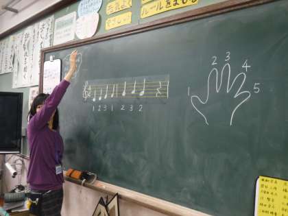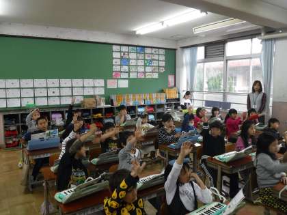 音楽の学習では,けんばんハーモニカを使い,指くぐりや指またぎの学習を行いました。