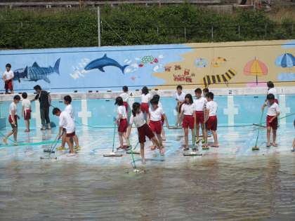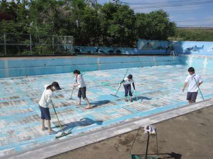 6月9日(金)5・6校時にプール掃除を行いました。雨天のため7日(水)から延期となっていた取組です。すでに水を抜き,プールの底に少したまる程度の水が残っている状態にされていました。