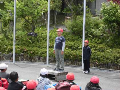 こちらは自然に囲まれた素晴らしい場所です。所員さんからの諸注意を聞き,入所式では,旗揚げや誓いの言葉をがんばった子どもたちでした。