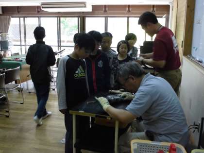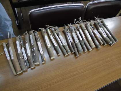 朝食の後,午前中前半の活動は小枝温度計づくりに取り組みます。やすりでこすって,ボンドを使って飾りや温度計を接着します。