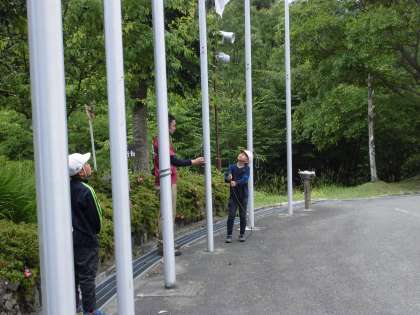 校歌を歌い入所式で掲揚した校旗を降納しました。そして校長先生のお話,花背山の家の先生のお話,児童のお礼の言葉,先生からのお話と続き,花背山の家の職員の方々に大きな声でお礼を言って,最後はハイタッチでお別れをしました。