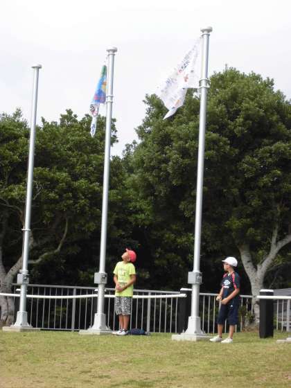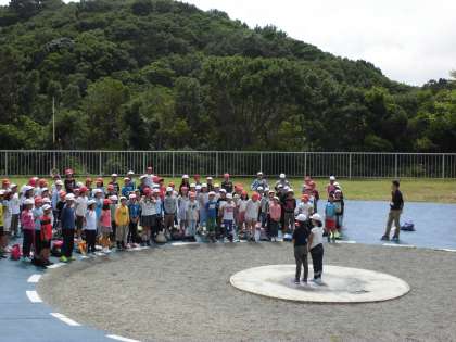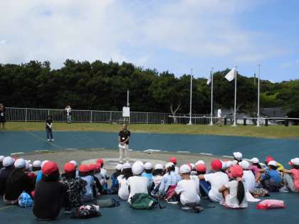 両校の校歌を歌い,旗揚げも完了。所員さんからみさきの家のことを聞き,次はプレイホールでオリエンテーションです。