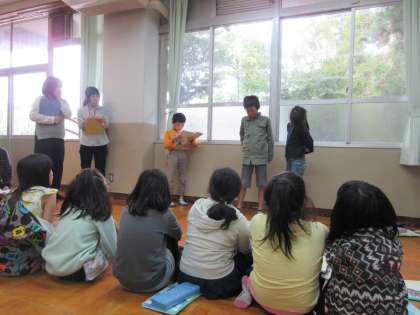 子どもたちは7つのグループ(本来は8つ)に分かれ,それぞれ2つ(3つ)のグループで場づくりをして,お互いの音読げきを発表し合いました。読むグループは,登場人物の気持ちが表れるように工夫して音読をします。聞くグループは,よかったところや工夫したらいいところなどを感想やアドバイスとして伝えました。そして,もう一度,その内容を踏まえて,グループ練習に取り組みました。