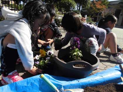 ゲストティーチャーに,花の植え方や育て方などを教えていただき,実際にプランターに花を植えました。