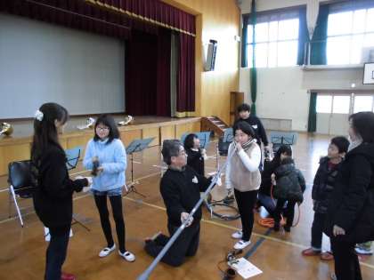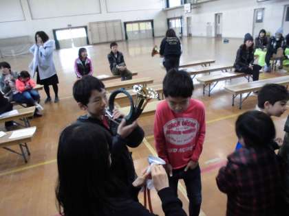 そしてホルンを実際に吹いてみる体験コーナーもご用意していただいて,子どもたちもがんばって音を出していました。