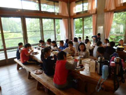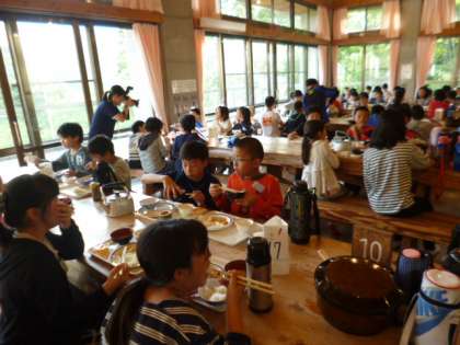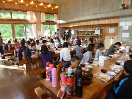 今夜の食事は、「山の家」の食堂でいただきました。広い食堂に、木でできた大きなきれいなテーブルが並びます。向島南、向島二の丸校の合同グループで座り、お皿を持ってバイキングへ。好きなおかずを取っていただきました。今夜は、子供の好きな串かつや春巻もありました。ごちそうさまでした。