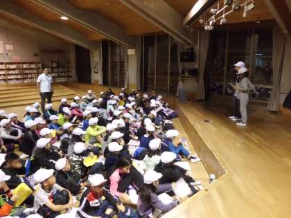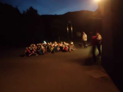 夕食、入浴をすませて、本館玄関前に集合。1班ずつランタンを持って、「いざ!ナイトハイクへ」。カードを探しながら所内を巡ります。そのカードで暗号を読取り、「魔王と子魔王」を倒し、どのグループも無事にもどることができました。その後、オリエンテーションホールにて、今日の振返りを行いました。明日も元気に過ごせますように。