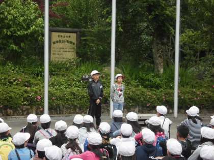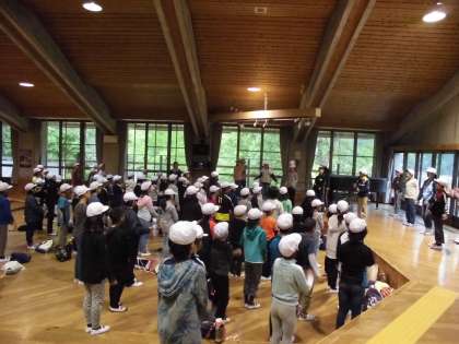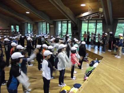 「山の家」での2日目の朝、子供たちはテントでもゆっくり眠れたようで、全員元気に起きてきました。体調不良を訴える子供は一人もいません。「朝のつどい」は、明徳小学校・伏見板橋小学校と共に行い、それぞれの学校紹介を行いました。代表の2人が、大きな声で元気に紹介することができました。