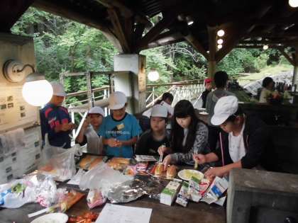 今日の朝食は、パックドックです。アルミホイルに包んだホットドックを牛乳パックにかまどに入れて燃やします。あっという間に、出来立てホヤホヤのおいしいホットドックができました。