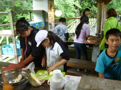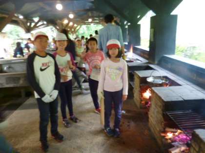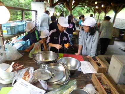 今日の昼ごはんは、野外炊事です。各グループに分かれて、それぞれのかまどで飯盒でご飯を炊いたり、大きな鍋ですき焼き風煮を作ったりました。仲良く調理したので、おいしく出来上がりました。