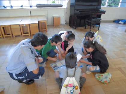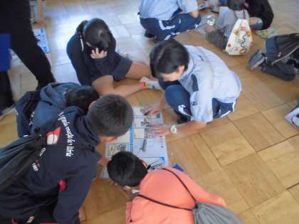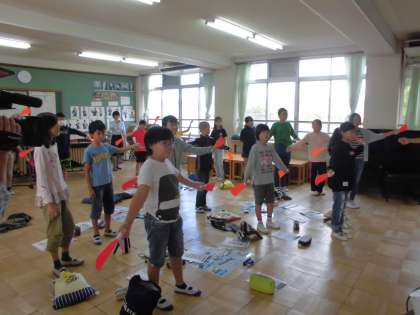 飛行機を誘導するグランドハンドリングスタッフの方にお話を聞きました。教えてもらったことからグループごとで話し合って,仕事について考えていました。また,実際に飛行機を誘導する動きをしてみました。