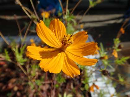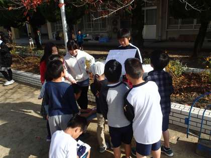 園芸委員会が中間休みに「フラワーフェスティバル」を行いました。今日は低学年が花壇付近に集まり,校内にたくさん咲いているキバナコスモスについての問題に答えました。問題に答えた人にはプレゼントがあるかもしれません。