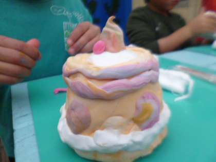 図画工作科の学習でスペシャルケーキを作りました。様々な空き容器に紙粘土をくっつけて,ケーキの土台を作りました。また,紙粘土に絵の具を練りこみ,思い思いにケーキにのせたいものを作ってつけました。