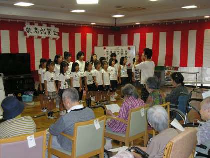 9月18日に地域の高齢者福祉施設「ヴィラ向島」で行われた敬老の日の集いに,向島南小学校コーラス部が出演しました。「赤とんぼ」や「ふるさと」は客席からも歌声がきかれ,とても喜んでいただきました。