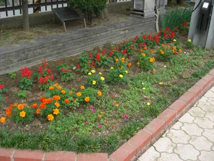 今、サルビア、インパチェンス、マリーゴールド、ポーチュラカ、グラジオラスなどの花がたくさん咲いています。今日は、梅雨の間に伸びてきた雑草を抜いて、花壇全体をすっきりきれいにしてくださいました。蒸し暑い中、どうもありがとうございました。