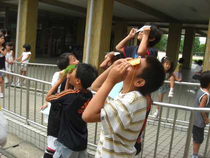 5,6年生の歓声を聞きつけて、他の学年も前庭のつばめ広場やピロティーに集まりました。待ちに待った日食の様子を、子どもたちは一生懸命観察していました。