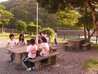 朝ご飯や昼ご飯は、芝生広場や野外テーブルで食べています。