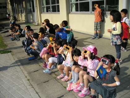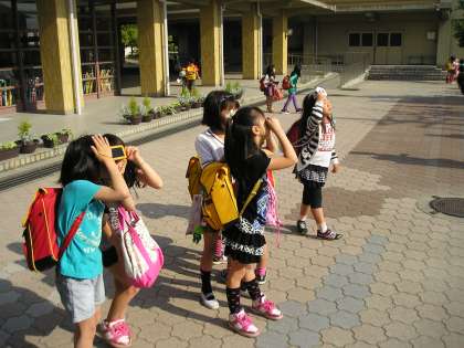 今朝,快晴に近い素晴らしいお天気の中,日食を観察することが出来ました。日食がはじまったのは,午前6時17分頃でしたが,見どころの金環日食が見られるのは,7時30分ころ。7時20分に,学校を開門すると大勢の子どもたちが登校してきて,つばめ広場で観察会が始まりました。太陽の中にすっぽりと月が入り,きれいなリングが出来ると,遮光板を手にした子どもたちは,口々に「すごい!」「きれい!」と歓声をあげていました。日本では,25年前に沖縄で観られて以来で,次回は18年後に北海道でしか観られないそうです。世紀の天体ショーを,地元京都で観ることが出来て本当に幸運でした。朝早くから付き添ってくださった保護者の皆さま,登校を見守って下さった地域の皆さまありがとうございました。