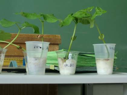 理科の「植物の発芽と成長」の授業で、インゲンマメを育てています。