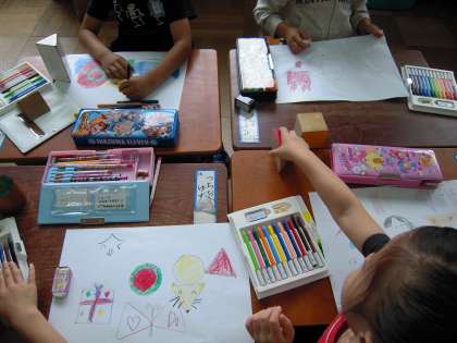 子どもたちは,丸や三角・四角の形から心にうかぶ物を,楽しそうに描いていました。