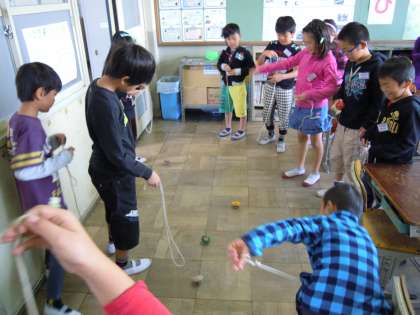 そこで,子ども達は「けん玉」「こま回し」「お手玉」などの昔遊びを,一生懸命練習しています。