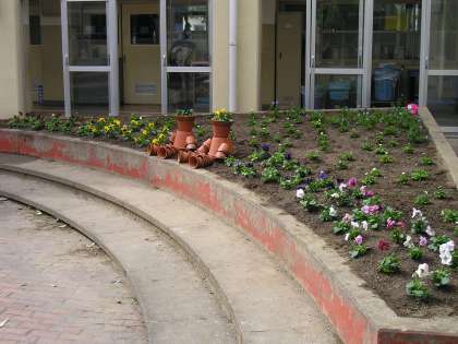 11月2日(金)4年生が,花育活動実践事業部の方たちにお世話になり,中庭の花壇に花を植えました。はじめ会議室で,植え方をていねいに教えていただき,いざ中庭へ。グループに分かれて,パンジーやブルーデージーなどを植え,花壇が花いっぱいになりました。また,真ん中に植木鉢で作ったポットマンをアクセントに飾り,寂しかった中庭がとても明るくなりました。保護者や地域の皆さまご来校の際に,是非ご覧ください。