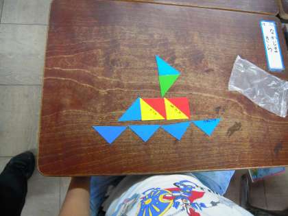 算数では今,かたちづくりの学習をしています。三角形を並べて,教科書にある形や自分で考えた形を作っています。