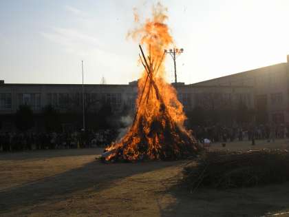 6日(日)の葦狩り・竹取りで集められた葦と竹を使って,12日(土)に組み立てられました。本校の5,6年生の「ふれあいキッズ」の子どもたちも,葦狩りからお手伝いしていましたが,13日(日)の午前8時,松明を手に点火させていただき,地域に伝わる行事を体感することができました。また,「太鼓クラブ」の子どもたちも,点火の前に「三宅太鼓」を披露し,オープニングを盛り上げました。9時からは,PTAや地域の諸団体の方々による,豚汁,ぜんざい,フランクフルト,焼き芋,温かい飲み物などがふるまわれたり,「昔の遊びコーナー」で羽子板やこま回しで遊んだりして,子どもも大人も楽しみました。お世話になった地域やPTA,諸団体の皆さま,野菜のご提供をしていただきました地域の皆様ありがとうございました。