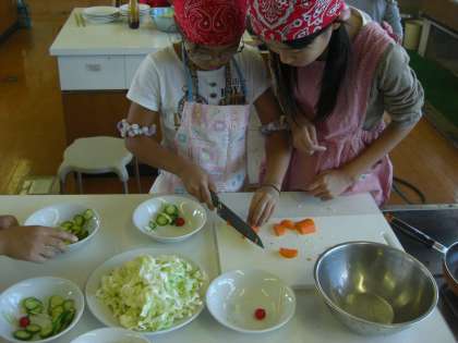 たまご料理は、ゆで卵、炒り卵が中心でしたが、中にはだし巻きを上手につくっていた子もいました。野菜は野菜炒めにしているグループがほとんどでした。でも、そばを入れて焼きそばにしているグループもあり、とてもおいしそうでした。