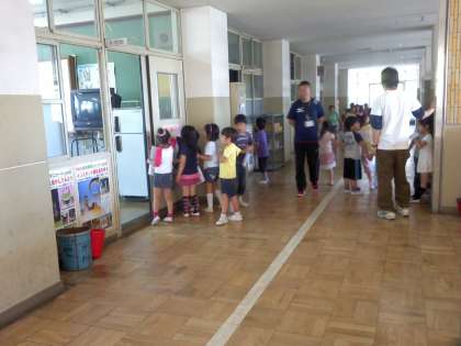 1.2時間目に学校探検をしました。2年生が1年生を案内していろいろな部屋や施設を案内して回りました。各部屋でシールを貼って,どんなものが部屋に置いてあるか見つけながら回りました。2年生が1年生の手を引きながら回る様子はとてもほほえましく感じました。