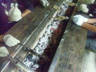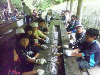 台風で心配していました魚つかみですが、予定通り行う事が出来ました。説明で聞いたように捕まえようとしたのですが、やっぱりすばしこくて悪戦苦闘でした。でも、みんなで協力し、つかめる事ができました。昼食に向けて、魚をさばき焼きます。魚や生き物の命を、頂くことで私たちが生きていること、そのことに子どもたちは、気づくと共に感謝しつつ、おいしく頂きました。