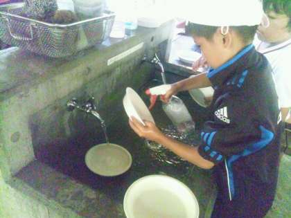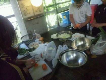 今日は2回目の野外炊事に挑戦します。1回目に野菜の切り方や水の量、かまどでの木の組み方などを教わりました。今日はその成果を発揮する日です。まずは食器の消毒と野菜の下準備です。適当な大きさ、小さすぎると溶けてしまい、大き過ぎるとなかなか柔らかくならない事は経験済みです。真剣なまなざしで取り組んでいます。