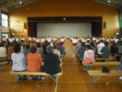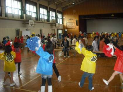 昼食後に4年生と2年生が運動会で披露した「よっちょれ」と「花笠踊り」を演じました。