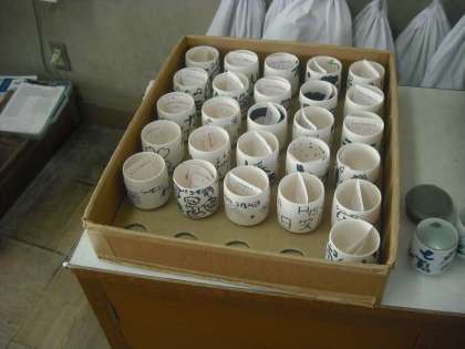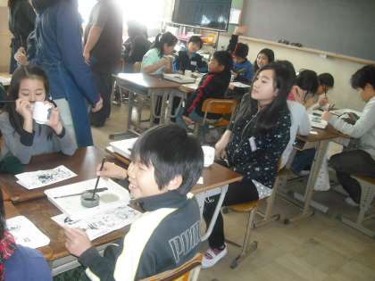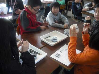 午後から4年生が清水焼の湯呑茶わんに絵付けをする体験活動をしました。