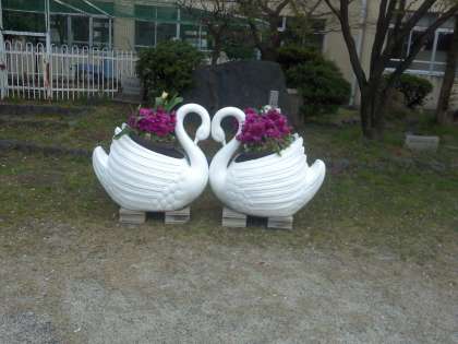 正門を入った奥の方に目立たずに置いてあった白鳥の彫刻ですが,前面に出してきて,花のプランターを置くことで,引き立つようになりました。