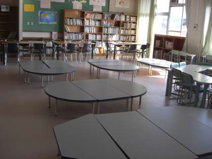 12月の半ばより,掃除の合間を縫ってそれぞれの学年が自分たちのできるところを分担しながら,図書や机,カウンターなどを運び出しました。薄いピンクの板張りになった図書室は,スッキリと明るくなりました。