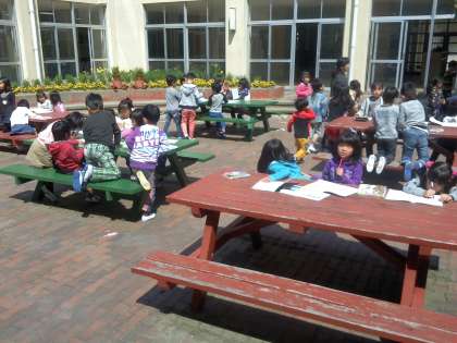 ポカポカと暖かい陽射しが降り注ぐ中庭で,中間休みに1年生の子どもたちがおおぜいお絵かきをしたり本をよんだりしていました。