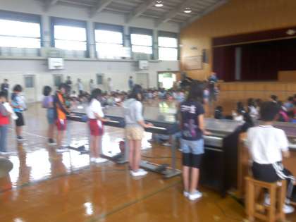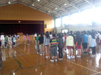 2校時に1年生を迎える会のリハーサルがありました。最初に2年生から6年生が全校合唱と全校合奏の練習をしました。それから,6年生が1年生をエスコートして入場する練習をしました。本番は,14日の5校時からです。