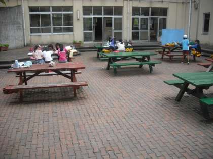しかし今度は,放課後の部活動を待っている子どもたちの居場所がなくなってしまいました。でも本校には,すばらしい場所があります。中庭です。部活動を待っている間,一体型の机・椅子で自学自習や読書をして待っていました。雨も止んで風通しのよい屋外でみんなしっかり学習ができました。