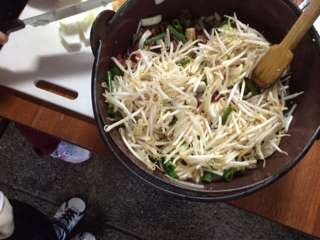 野外炊事の真っ最中です。かまどに火が入り,鍋もこれから煮え立とうとしています。一方で食器洗いもたいへんです。