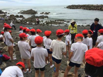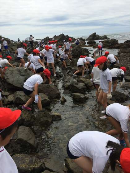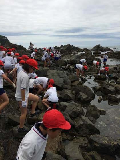みさきの家の近くの宮崎浜にやってきました。天気は曇りで波は穏やかです。磯観察には絶好の条件です。最初に注意を聞いて,いよいよ潮だまりの生き物を探し始めました。