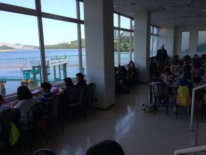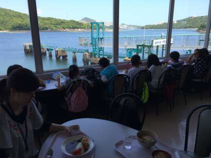 美しいベイサイドのレストランで昼食です。食べ終わるといよいよ学校に向けて出発します。